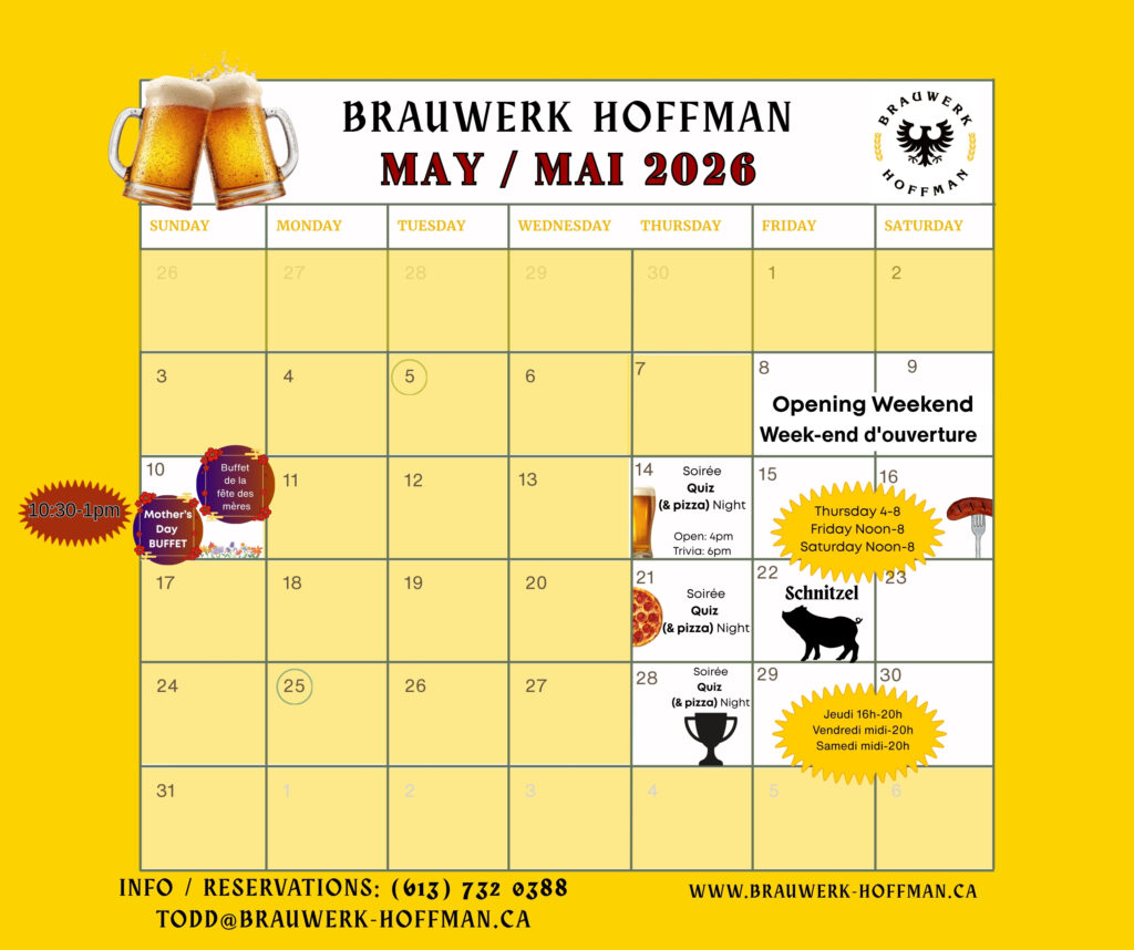 The restaurant is closed for the season, but will be hosting occasional events. Our retail store is open for beer and merch purchases — call ahead (613) 732 0388